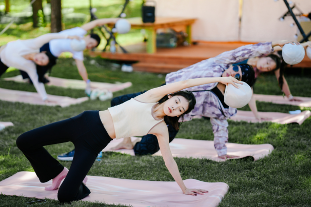 尺度还原的两大露台里,Lululemon瑜伽老师带领嘉宾舒展身心;垂钓桨板与品牌茶饮营造出邻里闲叙的松弛氛围;骑行区的单车与哈雷摩托女骑,唤醒户外活力;沙滩度假场景则提前呈现双泳池的惬意。这些并非临时搭建的“道具”,而是未来招商・揽阅社区生活的1:1 还原。“你今天听到的河风、看到的夕阳,就是未来在家推窗即见的日常;你此刻体验的瑜伽、闲读,就是明天在社区里随时可享的松弛。”