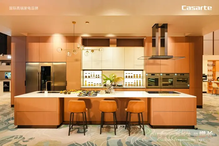 卡萨帝厨电所呈现的“原创全嵌科技”,则在美学与性能之间找到了平衡。搭载原创智慧恒风科技的烟机,可输出强劲而稳定的风量。在现场挑战中,轻松吹起80公斤的成人;新增“AI之眼”的致境Air则进一步实现智能交互。尤其值得一提的是全嵌抽屉式洗碗机,采用外置隐藏式重型滑轨,主持人体验即使内置30公斤壶铃,推拉过程依然平稳丝滑。此外,原创中岛升降油烟机、全球最先进的全域加热电磁灶、不挡视线不挡锅的三折叠烟机等产品,共同构建出兼具社交属性与烹饪效能的高端厨房场景。